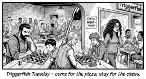 This past Triggerfish Tuesday was not just hot… it was swelteringly, question-your-life-choices hot. Normally, Charlie enjoys his peaceful outdoor chess sessions (and cigarettes), safely separated from the chaos inside. The… - ♟️ Triggerfish Tuesday – Pizza, Pawns & Mama Queen Adventures